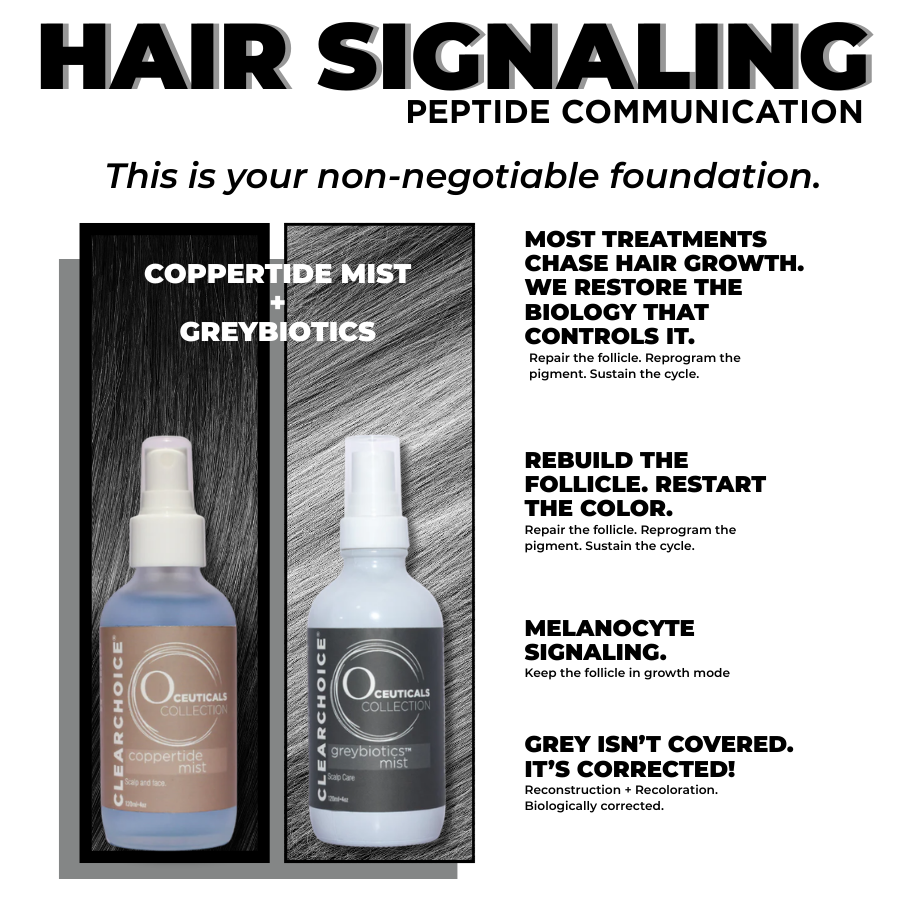 Use CopperTide Mist, a biomimetic peptide complex that reawakens aging follicles by boosting cellular regeneration and microcirculation. CopperTide Mist supports melanocyte vitality—the pigment-producing cells—to help slow or reduce greying while strengthening scalp architecture.